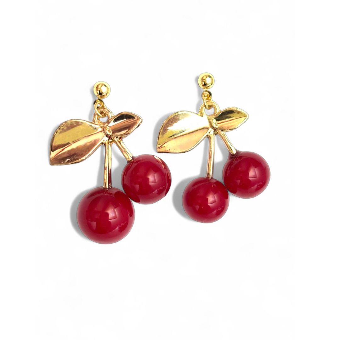 Add a playful yet elegant touch to your look with these Golden Cherry Drop Earrings. Featuring glossy red cherry beads paired with polished gold-tone leaves, they bring a pop of color and a hint of whimsy to any outfit. Lightweight and eye-catching, these earrings are perfect for both casual days and fun nights out.